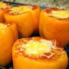 3. Remove and discard the tops, seeds, and membranes of the bell peppers. Arrange peppers in a baking dish with the hollowed sides facing upward. (Slice the bottoms of the peppers if necessary so that they will stand upright.)