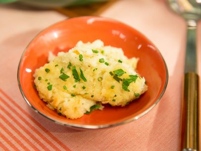 For the topping: Pour the melted butter over the potato mixture and bake until bubbly and slightly golden, about 45 minutes. Garnish with the chives and parsley. The potatoes can be kept warm in a 200-degree oven or tented with foil until ready to serve, up to 2 hours.
