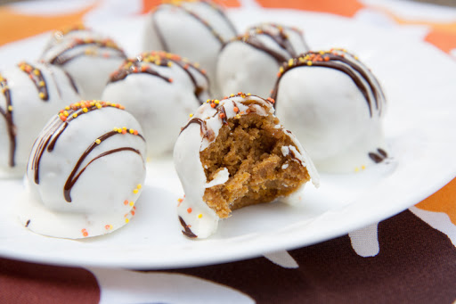 I really like the way these cake balls look with a little dark chocolate drizzled on top and some fall-colored sprinkles, but, take it from me, don’t be tempted to swap out the candy coating for chocolate. I’ve done them with chocolate before, and they’re still delicious, but the chocolate way overpowers the pumpkin spice cake and cream cheese frosting. Stick with the vanilla or white chocolate coating.