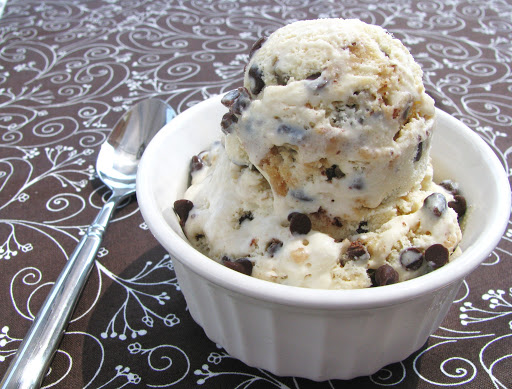 Once the mixture is chilled, freeze in an ice cream maker according to the manufacturer’s instructions. Chop the disk of cookie dough into small chunks. As soon as the mixture is done churning, transfer to a bowl or airtight container and stir in the chocolate chips and the chunks of cookie dough. Store in the freezer until firm.