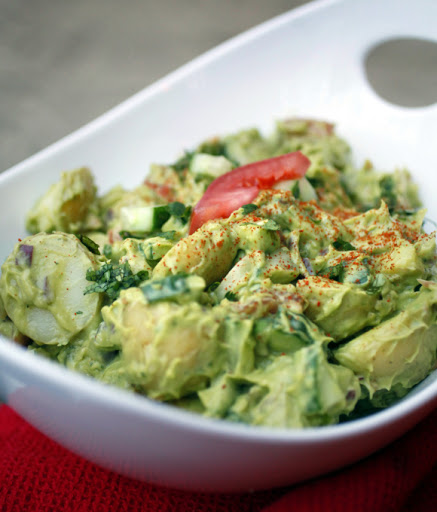 Put the potatoes and cucumbers in a large mixing bowl. Add the avocado mixture and mix well, being sure not to mash the potatoes. Taste and add more salt and lime juice to taste. Sprinkle a little extra cayenne pepper on top, if you like.