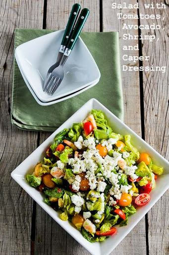 Greek Salad with Avocado, Shrimp and Caper Vinaigrette