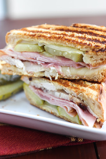 2.Spread all bread slices on one side with Dijon mustard. Top a slice of bread with swiss cheese, turkey meat, ham, pickles, and second slice of swiss cheese; top with second slice of bread, Dijon side down. Repeat to make a second sandwich.