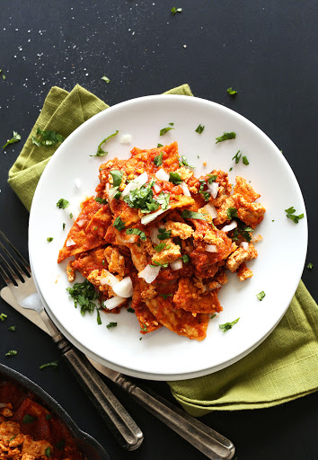 Add chips to the pan and pour over sauce, stirring quickly to coat. Then top with tofu scramble, fresh onion and cilantro and serve immediately. Additional toppings might include hot sauce, lime juice, salsa and/or Vegan Mexican Cheese. Serves 2-3. Best when fresh.