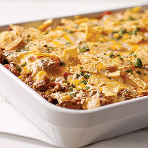4. BAKE 30 min. or until heated through. Top with crushed chips and cilantro.