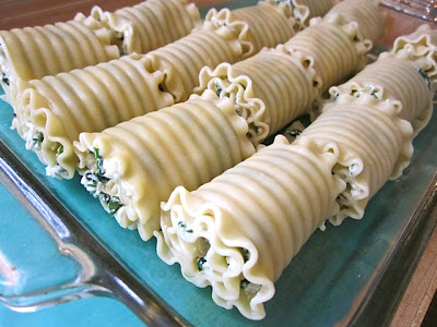 Roll the noodles up and place in the prepared casserole dish. Repeat until all of your filling is gone (there may be some noodles left over, these are "back ups" in case any of the others rip during assembly). Pour the marinara sauce over the rolled noodles making sure to cover all surfaces. The sauce will keep the noodles hydrated and soft while baking.