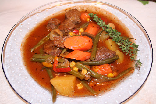 Brown meat in oil in a Dutch oven. Add water or broth, onion, seasonings and tomato paste. Cover and simmer for 1 1/2 hours or until meat is tender. Stir in potatoes, carrots and green pepper; simmer 30 minutes. Add additional water if necessary. Stir in remaining ingredients; cover and simmer 20 minutes.