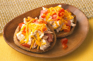 SPOON onto muffin halves; top with tomatoes and cheese.