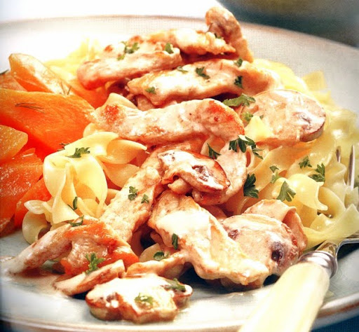 Add onion, mushrooms, garlic, salt and pepper to pan; cook over medium heat, stirring occasionally, until no liquid remains, about 10 minutes. Return pork to pan. Stir in sour cream and stock; cook, without boiling, until hot, 1 minute. Stir in lemon juice. Sprinkle with parsley.