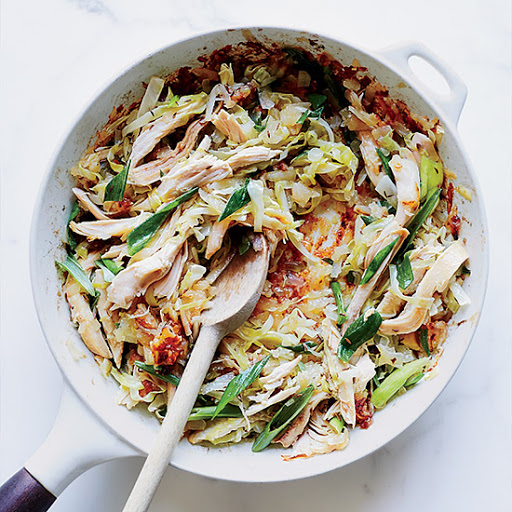 In a large cast-iron skillet, heat the olive oil. Add the onion and potato and cook over moderately high heat, stirring occasionally, until golden and tender, 7 to 8 minutes. Add the sauerkraut, turkey, scallions and caraway and cook until golden, 3 minutes. Season with salt and pepper.