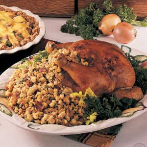 Spread in a greased 13-in. x 9-in. baking dish (dish will be full). Dot with butter. Cover and bake at 350°F for 30 minutes and stuffing temperature reaches 165°F. Uncover and bake 10 minutes longer or until lightly browned. Yield: 13 cups.