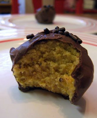 When ready to dip, melt the candy melts (I used two bags of melts total) a 1/2 bag at a time following the directions on the package. Roll with a spoon and place on another waxed paper lined sheet. Scatter on sprinkles if using while the chocolate is still wet. Store at room temperature.