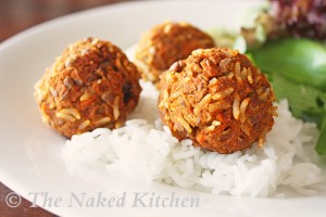 The Naked Kitchen site said: Lentils make a great substitute for meat and I knew that I could make a great meatless meatball.  I used an old family recipe and switched a few things around and ended up with a great tasting dinner that everyone loved.  My meat loving hubby gave these 2 thumbs up and even the kids enjoyed them (they didn’t like them too much on their own but once we put a bit of