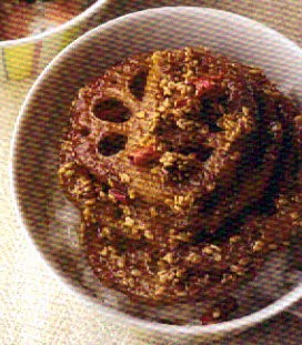 When renkon is lightly browned, add sesame seeds and chilis. Stir fry briskly.