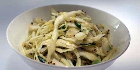 2. In a saucepan, bring the vinegar, oil, sugar, mustards, garlic and coriander to a boil. Let simmer for about 3 minutes. Pour over the cabbage mixture. Toss well. Season with salt and pepper.