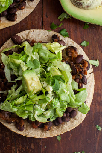 Top the tortillas with a layer of black beans, then salad, adding salsa, if desired.