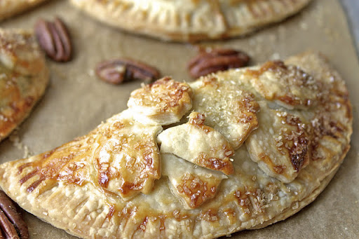 Brush the pastry surfaces lightly with some of the beaten egg. Scoop a scant ¼ cup of the pecan filling onto each round and fold the pastry over to make a turnover. Press the edges to seal and crimp with the tines of a floured fork. Brush the tops of the pies with the beaten egg and arrange the cut out shapes decoratively, if desired. Brush again with the egg wash and sprinkle with the turbinado sugar. Using a sharp knife, make a small slit in the top of each pie.