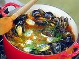 Season fish chunks with salt and pepper. Add fish and simmer 5 minutes, giving the pot a shake now and then. Do not stir your soup with a spoon after the addition of fish or you will break it up. Add shrimp, scallops, and mussels and cover pot. Cook 10 minutes, giving the pot a good shake now and again.