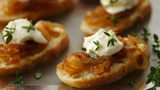 Place 1 teaspoon caramelized onions on each bread slice; top with 1 rounded teaspoon cream cheese. Sprinkle with herbs.