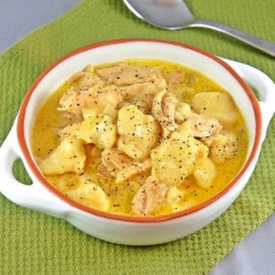 5. Once it is finished simmering, drop dough by the tablespoon-full into chicken stew mixture. Cover again and finish cooking over medium-low heat for 15 minutes or until dumplings are fully cooked.