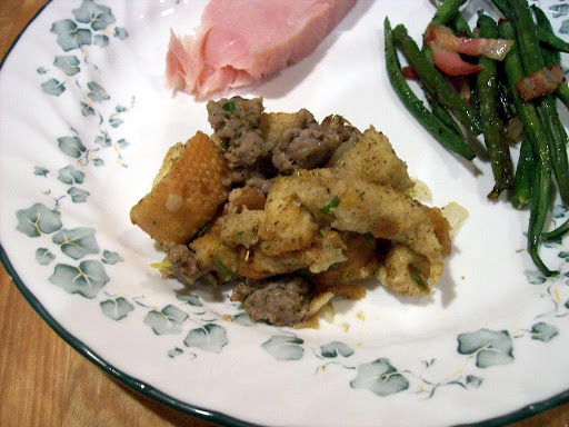 In a large mixing bowl, toss the bread cubes with the herbs and seasonings. Add the vegetables with the butter and the drained sausage. Stir in chicken broth until well moistened, but not mushy.