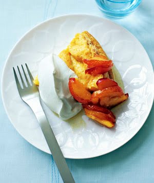 4. Pour the batter into the prepared dish. Bake until golden, about 45 minutes. Let cool for 20 minutes. Slice and top with the plums and whipped cream.