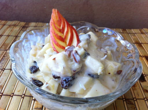 Mezcla la crema y la Lechera en un tazón. Posteriormente incorpora la manzana, la piña y la uva pasa.