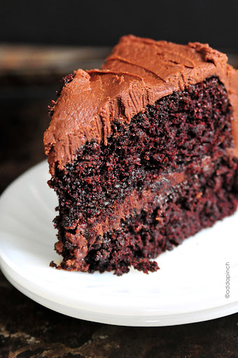 Add milk, vegetable oil, eggs, and vanilla to flour mixture and mix together on medium speed until well combined. Reduce speed and carefully add boiling water to the cake batter. Beat on high speed for about 1 minute to add air to the batter.