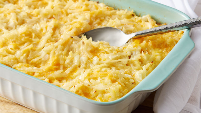 2. In large bowl, combine 1 pint (2 cups) sour cream, 1 can (10 3/4 oz) condensed cream of chicken soup, 1/2 cup melted butter, 1 tablespoon garlic salt, 1 cup chopped onions, 1 bag (30 oz) frozen country-style shredded hash brown potatoes, partially thawed, and 2 cups shredded Cheddar cheese (8 oz); stir until well blended.