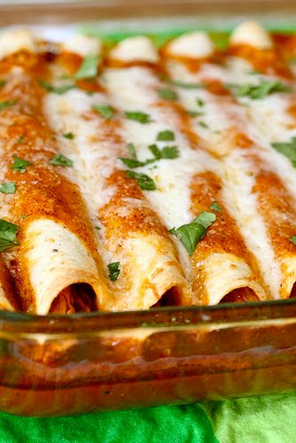 Reduce the oven temperature to 400˚ F. Remove the enchiladas from the oven and pour the sauce oven the top. Sprinkle with the remaining shredded cheese. Cover the dish with foil and bake for 20 minutes.