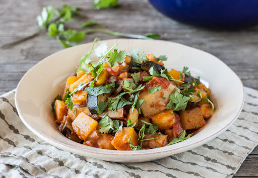 1. Add a think layer of water or broth to a heavy casserole dish or dutch oven over medium-high heat. Add the onion and cook for about 5 minutes. Stir in the garlic and chile pepper. Cook for about 2 more minutes stirring often. Add the squash, parsnips, zucchini, eggplant and potato. Cook until the vegetables brown up a bit and become fragrant. About 5 minutes.