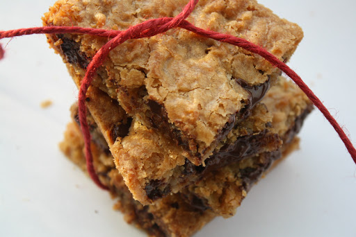 Pour the batter into the greased baking dish, and smooth the top with a rubber spatula. Bake for 25-30 minutes—do not overvbake! The center should still be soft. Let the blondies cool before turning them out onto a cutting board and slicing into squares.