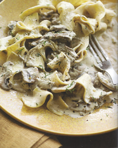 When the noodles are ready, drain them and return to the cooking pot. Add the remaining 1 tablespoon butter and toss to coat. Divide the noodles amount dinner plates and top each serving with the steak and sauce. Sprinkle with dill and serve.