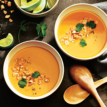 2. Add broth and next 5 ingredients (through salt); cover. Bring to a boil. Reduce heat, and simmer 5 minutes, stirring frequently or an additional 5-10 minutes if using fresh squash until fork tender. Place half of squash mixture in a blender. Remove center piece of blender lid (to allow steam to escape); secure blender lid on blender. Place a clean towel over opening in blender lid (to avoid splatters). Blend until smooth. Pour into a large bowl. Repeat procedure with remaining squash mixture. Spoon about 1 cup soup into each of 4 bowls; top with 2 tablespoons peanuts and 1 tablespoon cilantro. Serve with lime wedges.