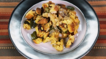Meanwhile, tear up all of the bread into small dime-size pieces. Place in a large bowl and moisten with some hot water. The bread should be moist, not soggy and wet. Add the moistened bread pieces, pan juices from the turkey, 1 stick of melted butter and salt and pepper to the cooked vegetables. Stir to combine. Serve stuffing with turkey gravy on the side.