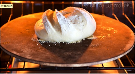 Place broiler pan on bottom of oven. Place baking stone on middle rack and turn oven to 450° heat stone at that temperature for 20 minutes. Dust dough with flour, slash top with serrated or very sharp knife three times. Slide onto stone. Pour one cup hot water into broiler pan and shut oven quickly to trap steam. Bake until well browned, about 30 minutes. Cool completely.