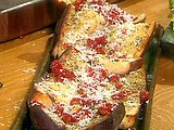 Liberally apply garlic butter to bread halves. Bake in oven until light golden brown. Remove and top with basil, sun-dried tomatoes and Parmesan.
