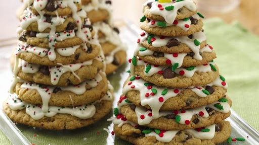 Heat frosting in microwavable bowl uncovered on High 30 seconds, stirring every 10 seconds, until frosting can be stirred smooth and fluid. Each tree will be a stack of 8 different size cookies. To assemble 3 trees, stack cookies on serving platter, starting with largest size cookie on bottom, and stacking each smaller size cookie on top, spreading frosting between each layer. Drizzle remaining frosting over trees, and garnish with sprinkles. Sprinkle powdered sugar on platter to look like snow.