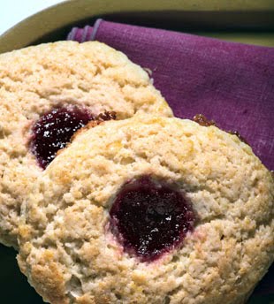 2.Gather dough together and turn out onto lightly floured work surface; knead briefly, 4 to 5 turns. Pat or roll out dough to 1-inch-thick round. Using 2 1/2- to 2 3/4-inch-diameter cookie cutter or biscuit cutter dipped in flour, cut out rounds. Re-roll dough scraps and flatten to 1-inch thickness; cut out additional rounds. Transfer scones to prepared rimmed baking sheet, spacing scones about 1 inch apart. Using thumb, push down center of each scone to make deep indentation. Spoon about 1/2 teaspoon preserves into indentation of each scone.