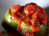 Remove core and seeds from peppers. Slice into 1 inch rings and place on nonstick baking sheet. You should get about 3 rings per pepper. In a large bowl mix together beef, turkey, bread, 1/2 cup of the tomatoes, garlic, egg, onion, chopped sage, Worcestershire sauce, hot sauce, and season with salt and pepper. Press meatloaf mixture evenly into pepper rings. In a skillet over medium-high heat, add oil. Saute meatloaf rings on both sides until golden brown, about 5 minutes per side. Add remaining tomatoes to skillet and bake until cooked through, 20 to 25 minutes. Meanwhile, in a small saucepan, heat 1-inch vegetable oil until a deep-fry thermometer reaches 325 degrees F. Drop sage leaves into oil and fry until golden, 1 to 2 minutes. Garnish meatloaf rings with fried sage leaves.