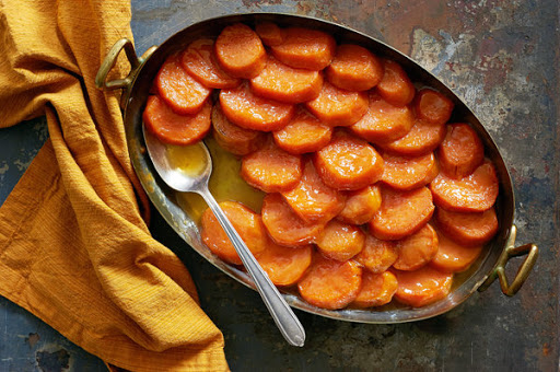 When Fred Harvey opened his first Harvey House restaurant in 1876 on the railway line in Topeka, Kan., his idea was radical for the time: Railroad passengers would be fed good food in a pleasant environment by a cadre of wholesome young women shipped in from the East. His concept was so successful that it spawned 84 restaurants, a Hollywood movie and an official cookbook. And it was in “The Harvey House Cookbook” by George H. Foster and Peter C. Weiglin that we found this excellent recipe for sweet potatoes candied with confectioners’ sugar and butter. As the whole thing bakes, the sugar melts and caramelizes, becoming a brittle and crunchy shell covering the soft orange potatoes within. This dish is best served warm rather than piping hot, which makes it convenient for Thanksgiving. Bake it before you roast your turkey, then reheat it briefly just before serving.