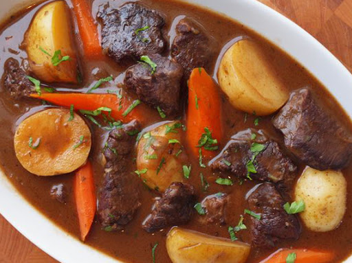 Remove pot from oven and add carrots and potatoes. Cover and place back in oven for 50-60 minutes more, or until vegetables are cooked and meat is very tender. Taste and adjust seasoning if necessary (freshly ground black pepper and a pinch of sugar go a long way). Let cool, then store in refrigerator overnight or until ready to serve. This stew improves in flavor if made at least 1 day ahead. Reheat, covered, over medium heat or in a 350°F oven. Garnish with fresh parsley if desired.