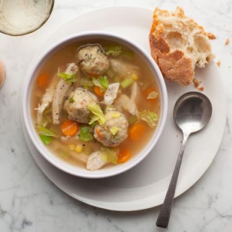 Classic turkey soup made with broth from the carcass of a roasted turkey, flavored with sweet mirepoix and thyme, and thickened with stuffing dumplings.
