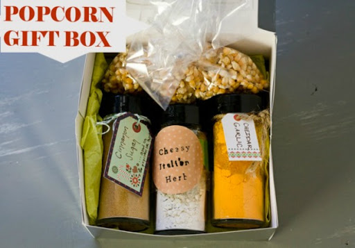 Putting the box together is simple. Layer tissue paper along the bottom of the box.  Fill and label each jar, then nestle them into the gift box.  Add a bag of popcorn seasonings, and tie the gift box shut.