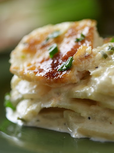 Coat the bottom of the prepared baking dish with 1/3 cup heavy cream. Place 1 layer of parsnips, shingled and slightly overlapping in the bottom of the baking dish. Sprinkle in 1/4 cup sliced green onions, 1/3 cup Parmesan, and a 1/4 tsp of black pepper.