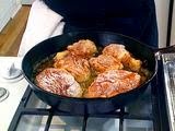 Place chicken skin side down into the pan. Put thighs in the center, and breast and legs around the edge of the pan. The oil should come half way up the pan. Cook chicken until golden brown on each side, approximately 10 to 12 minutes per side. More importantly, the internal temperature should be right around 180 degrees. (Be careful to monitor shortening temperature every few minutes.)