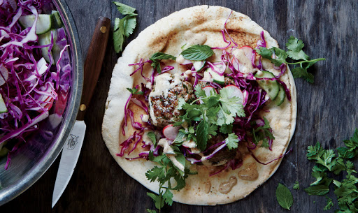 Serve lamb patties with pita bread, salad, herbs, and reserved sauce.