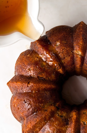 While the cake cools, make 10 slits on top with a paring knife and pour half the bourbon-sugar mixture on the still-warm cake. When the cake is fully cool, flip it and pour the rest of the glaze on the other side, then flip again to serve.