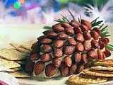 On a serving platter, make 2 pine cone shapes with the cheese. Begin to press the almonds at a slight angle into the cheese, starting at the narrow end of the pine cone shape.