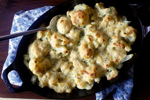 Spread cauliflower florets in a 2-quart baking ovenproof baking dish. Spoon sauce over florets and sprinkle with remaining 2 tablespoons cheese. Bake until until bronzed and bubbly, about 30 minutes. For reference, f I wasn’t in such a rush to get dinner out on the table, I’d have baked mine a minute or two longer, up to 35 minutes.